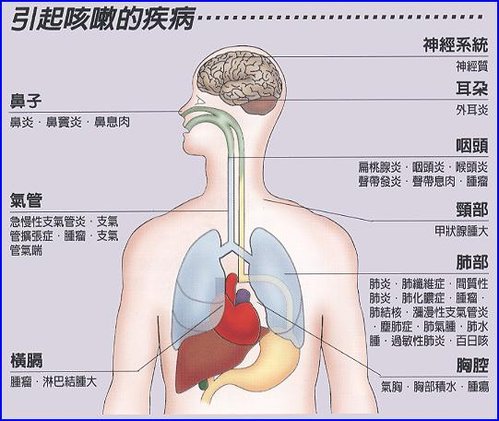 咳 嗽是要將氣管內的異物或分泌物排出體外的運動,是身體正常防禦反應之一。即使是健康的人,當他吸入煙或食物堵在喉嚨時就會開始咳,表示防禦系統在發揮作用 了。曾引起咳嗽的刺激包括:香菸的煙、機汽車排出的廢氣等化學性的刺激,或是誤吞異物的物理性刺激,其他如感染、腫瘍、過敏反應、心血管疾病等。