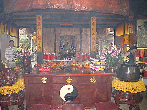 ~ 九龍池再進入即為草茅地母廟的主廟建築,地母廟的主建體分為三個部份 ,第一部份為大殿部份,採木材鐵片搭建的圓形主體部份,可供信徙參拜和打坐,大殿為擺放供品的神桌朝向第二部份神殿大門,地母娘娘等神像則在第二部份的八 卦形茅草塔建的神殿內,第三部份為八卦茅草神殿的後方有座 準提佛母的神殿 ~