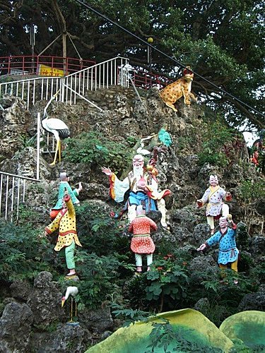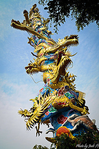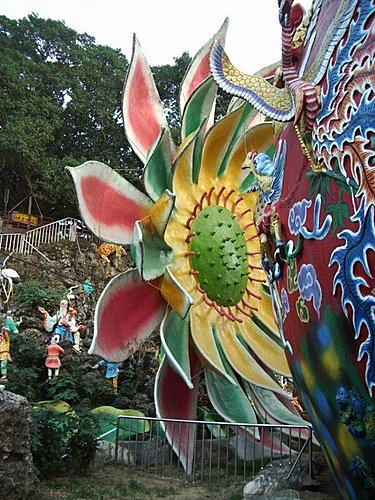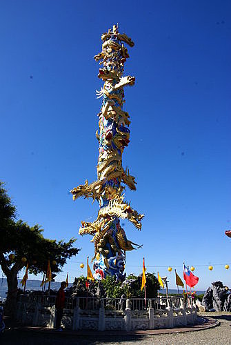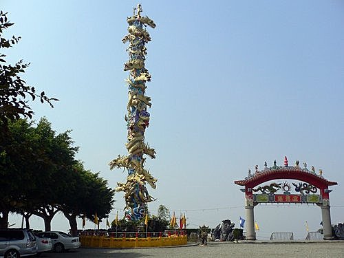 ~ 廟前有一根高達三十公尺之十九龍柱,底以紅色蓮花,托柱上攀緣著十九尾龍和十八羅漢塑像,頂部則是觀世音菩薩的立像,持淨瓶柳枝,象徵澤被蒼生。
