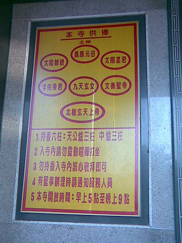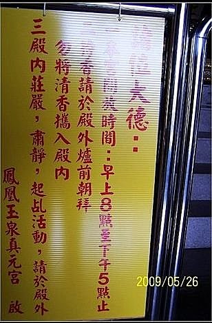 旁邊豎立一塊告示牌,禁止持香進入大殿並且禁止在殿內有起乩的活動,開放參拜的時間自早上 8 點到下午 5 點為止,前往參拜的香客必須算好時間,否則逾時不候
