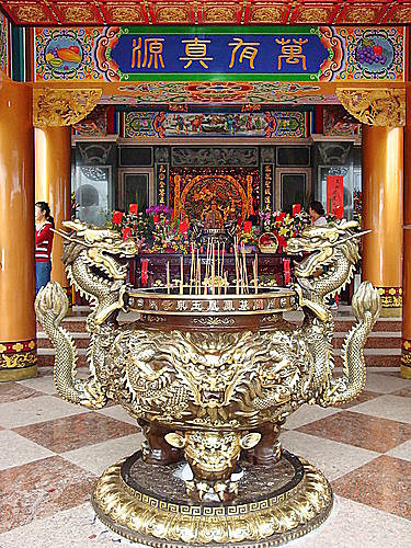 「開基鳳凰玉泉寺」的天公爐及拜亭,上面題有「萬有真源」四字