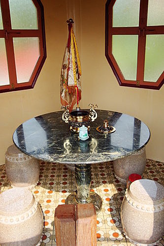 「元母亭」內的大理石圓桌上供奉著一支「鳳凰令」旗